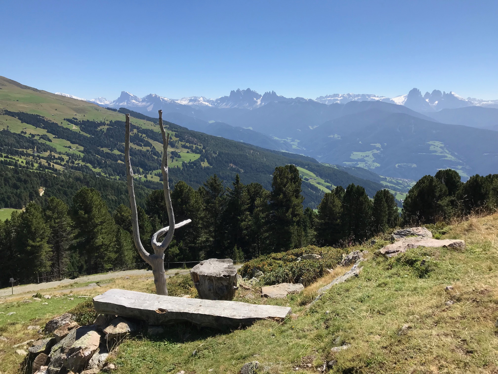On your way to the Cima San Cassiano (Kassianspitze), you pass by Santa Croce di Lazfons (Latzfonser Kreuz). It is a chapel at 2300 m. Local people built it to pray along 14 Stations of the Cross. To rest during the climb, there are a few benches: These 2 have the best view to the Dolomites (you see Sasso Piatto, Sasso Longo, Sella, Sass Rigais)